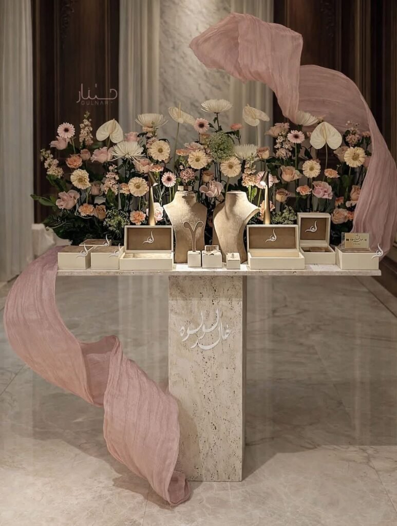 Jewelry table displays showcase elegant pieces in a stylish and organized way, adding a touch of luxury to any event.